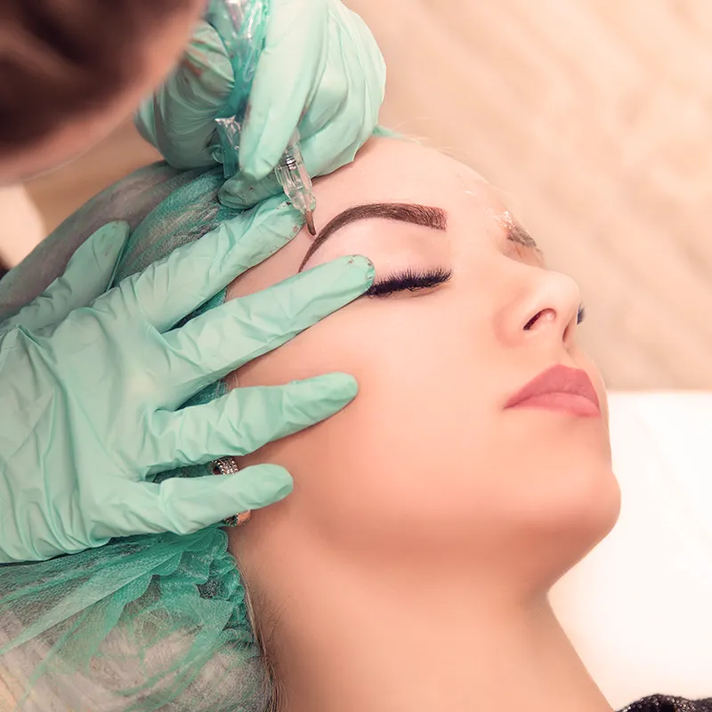 Nach der exakten Vorzeichnung wird die Haut betäubt. Anschließend werden feine Härchen pigmentiert, um dichte, natürliche Brauen zu schaffen. Die Farbe wird sanft eingearbeitet und fixiert.